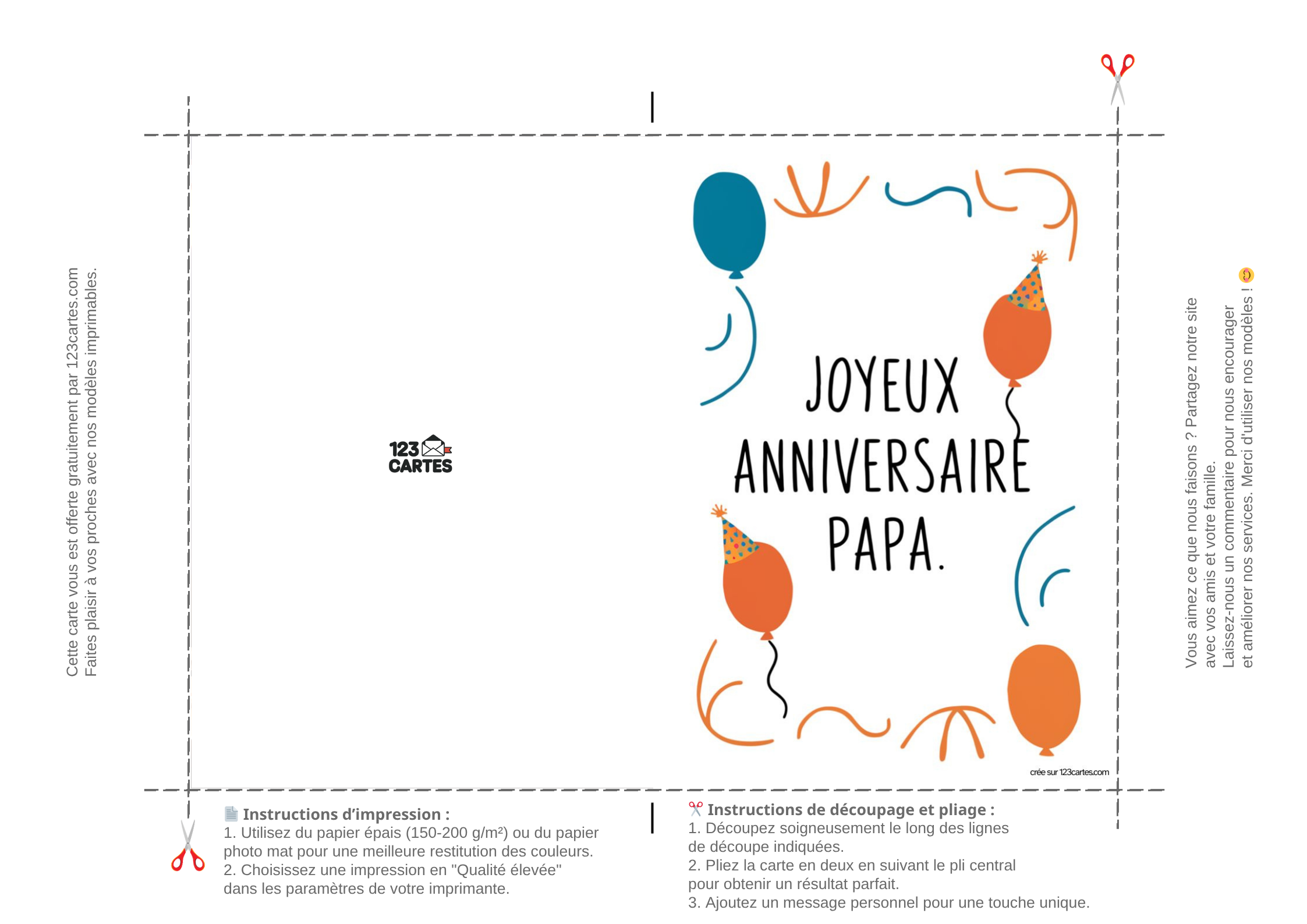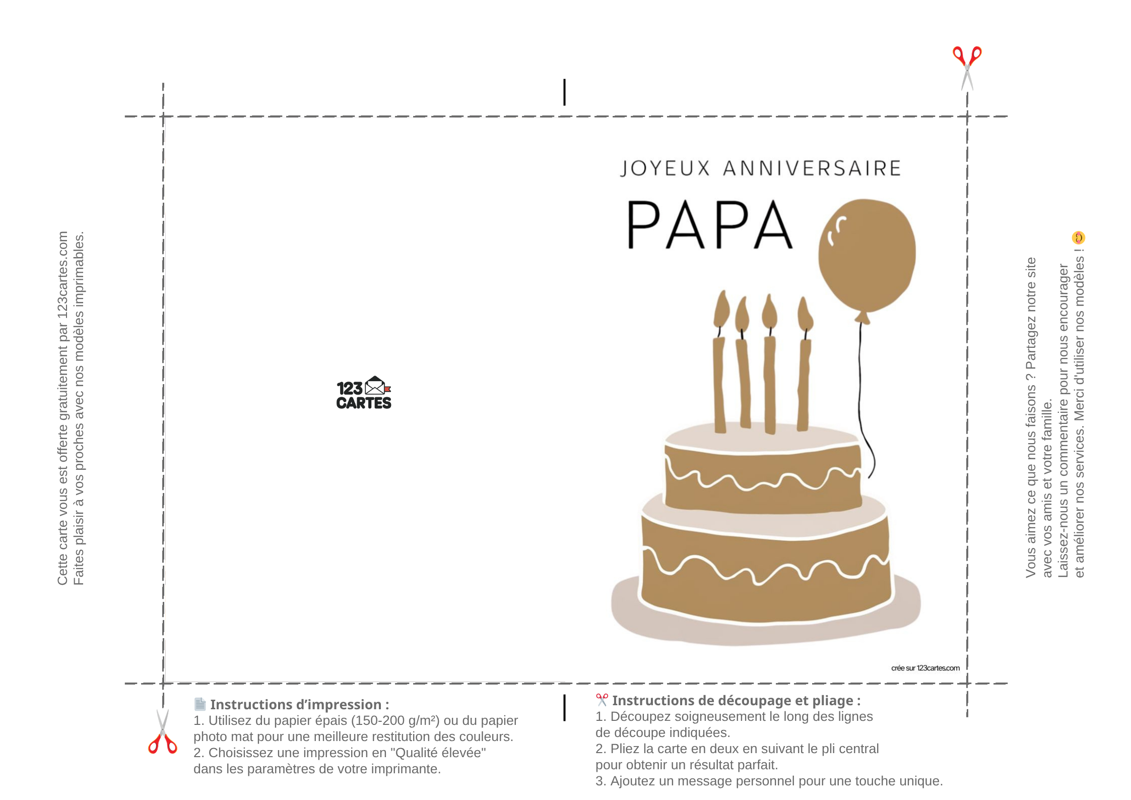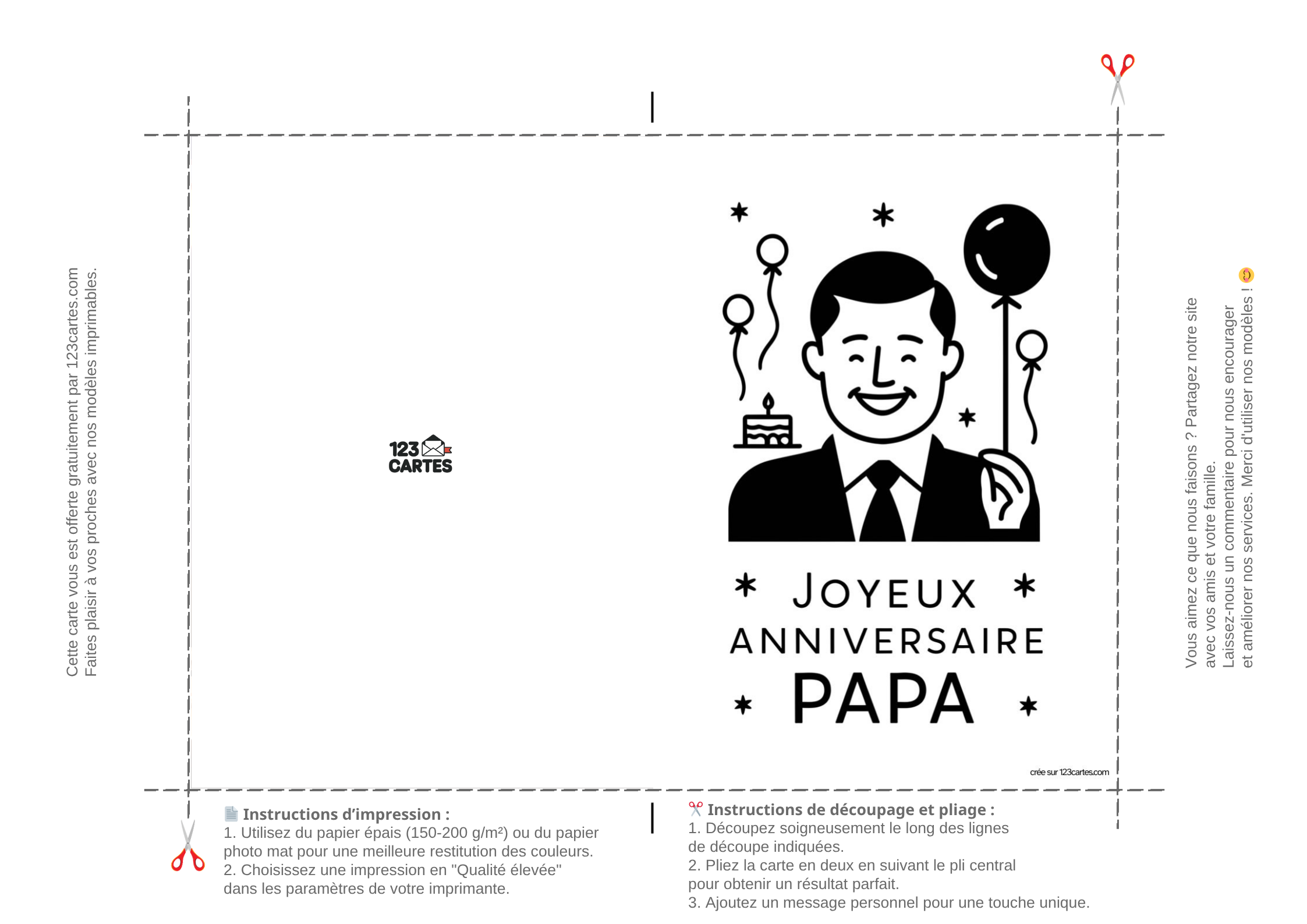 Vous cherchez une façon originale et personnelle de souhaiter un joyeux anniversaire à votre papa ? Rien de tel qu'une carte faite maison pour lui montrer combien il compte pour vous ! Sur cette page, vous trouverez des modèles de cartes d'anniversaire gratuits à télécharger et imprimer en quelques clics. Que vous soyez plutôt style sobre et élégant, humoristique ou carrément émouvant, il y a forcément une carte qui correspond à votre papa et à votre relation. L'avantage, c'est que vous pouvez les personnaliser en ajoutant votre propre message à l'intérieur. Et ça, croyez-moi, ça n'a pas de prix !