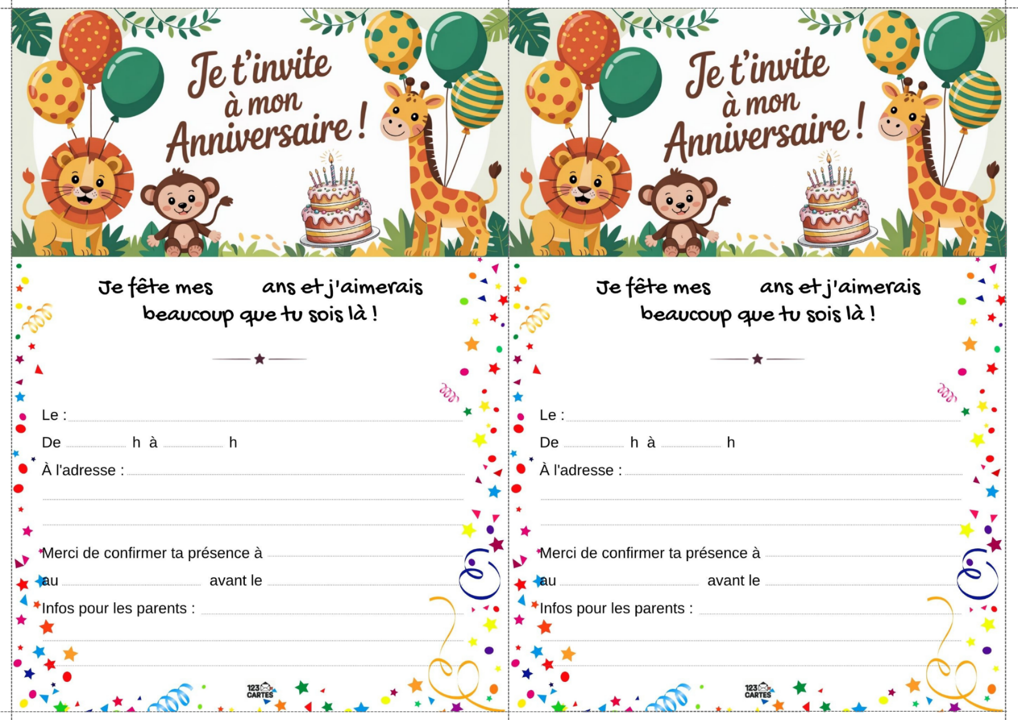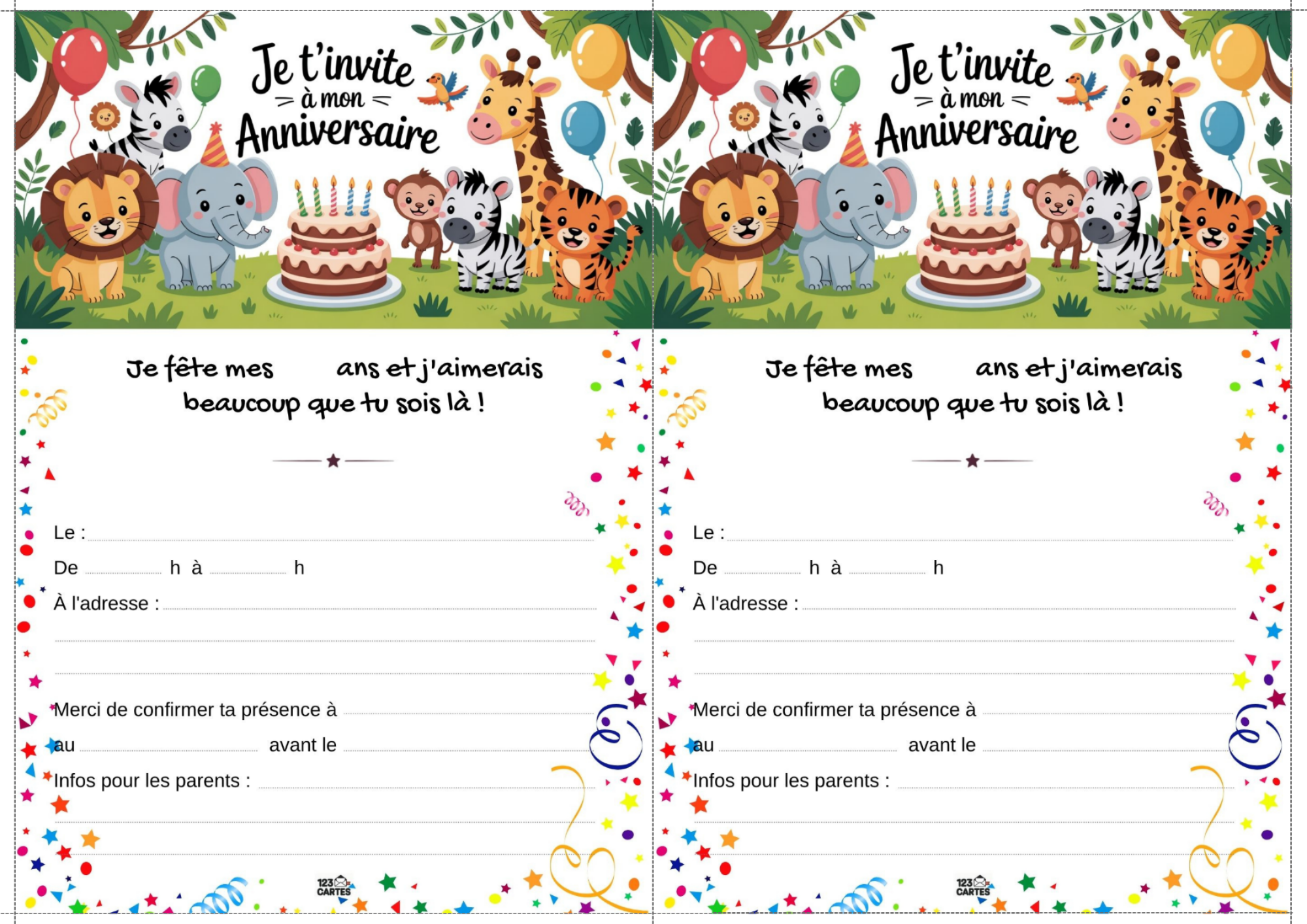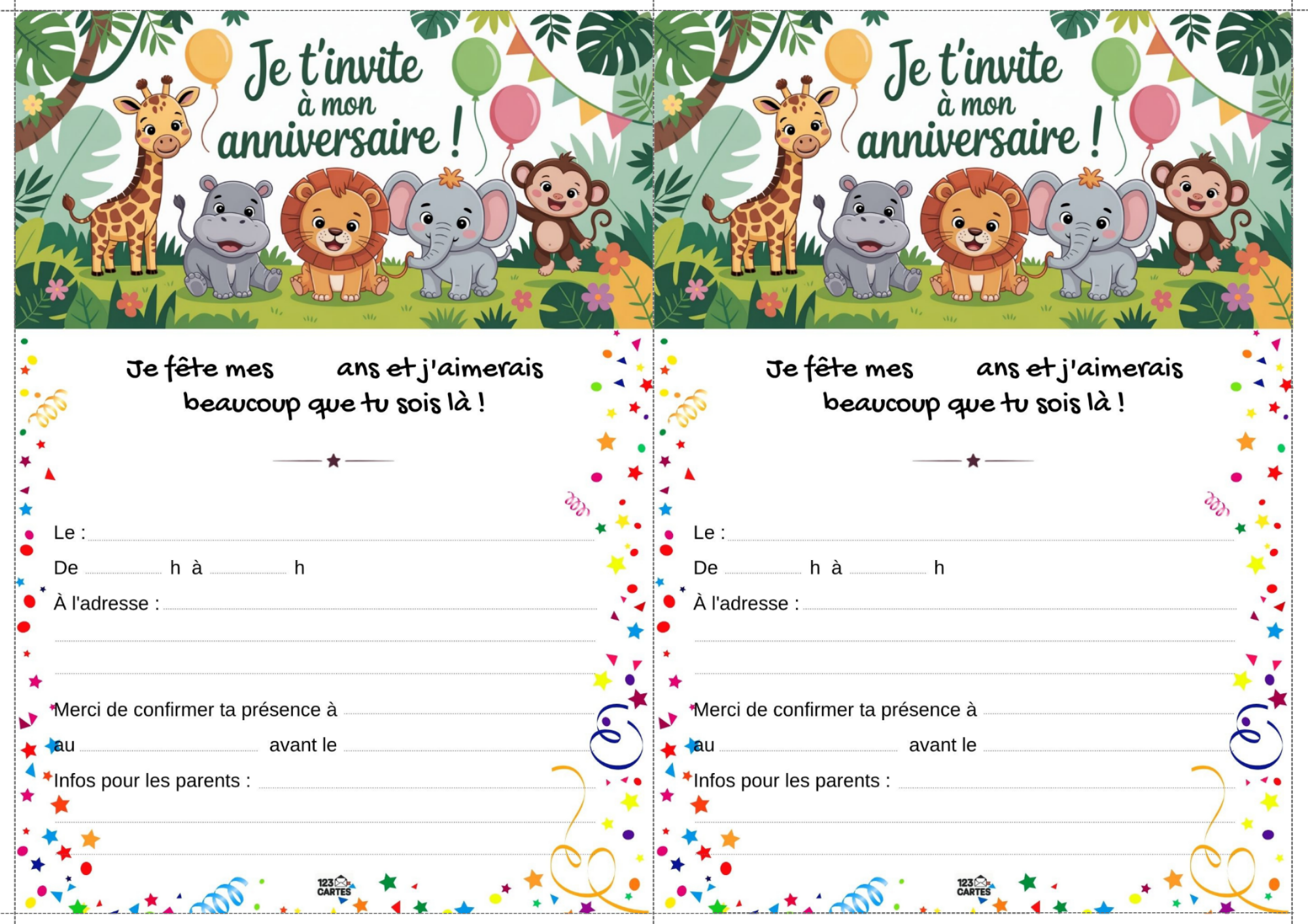 Notre modèle d’invitation sur le thème de la jungle est illustré avec des feuillages, des animaux rigolos et des couleurs vives. Elle est facile à personnaliser avec les informations de la fête : prénom, date, lieu et heure. Vous pouvez l’imprimer à la maison ou l’envoyer par message aux invités. C’est le premier pas vers une aventure inoubliable.