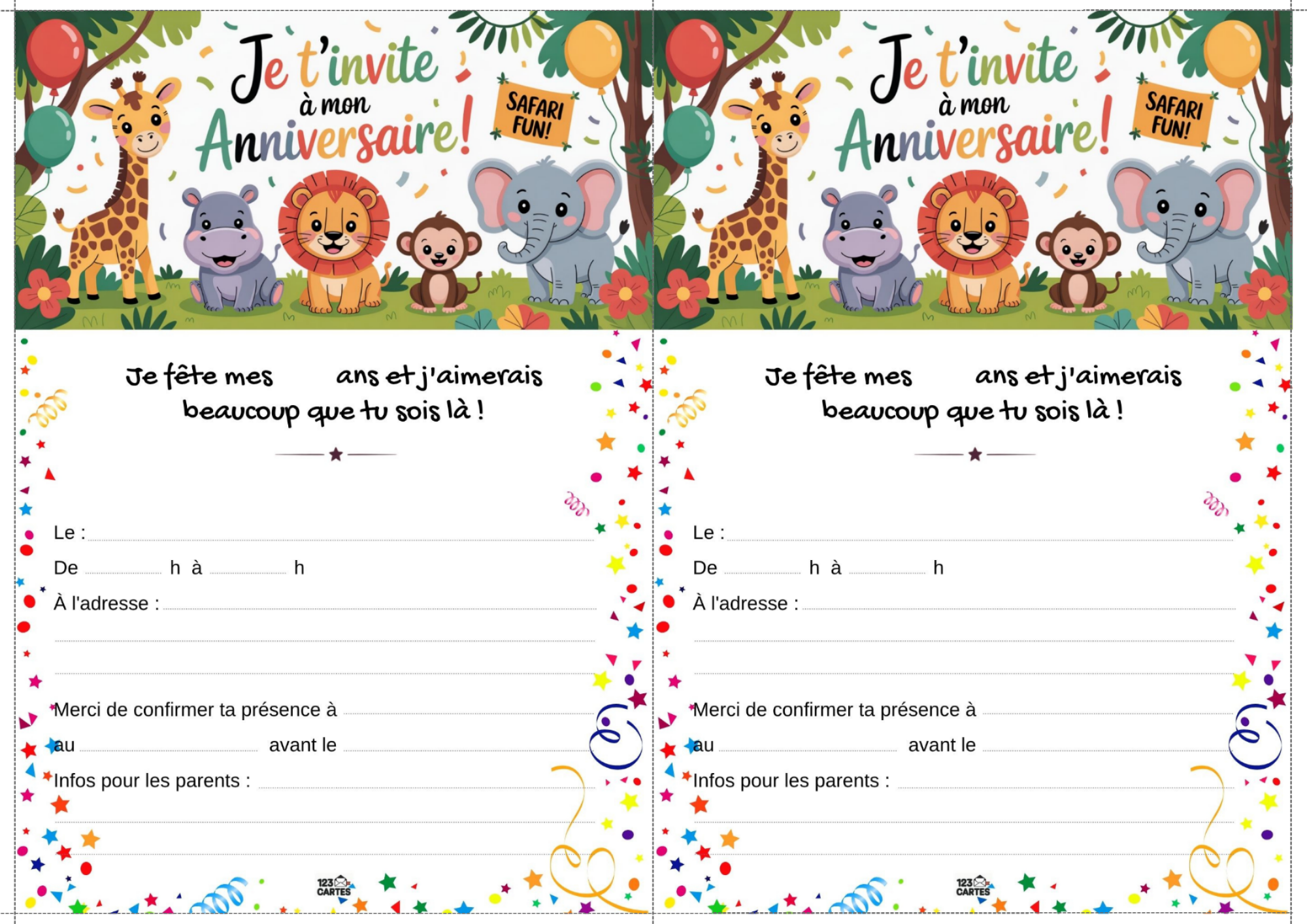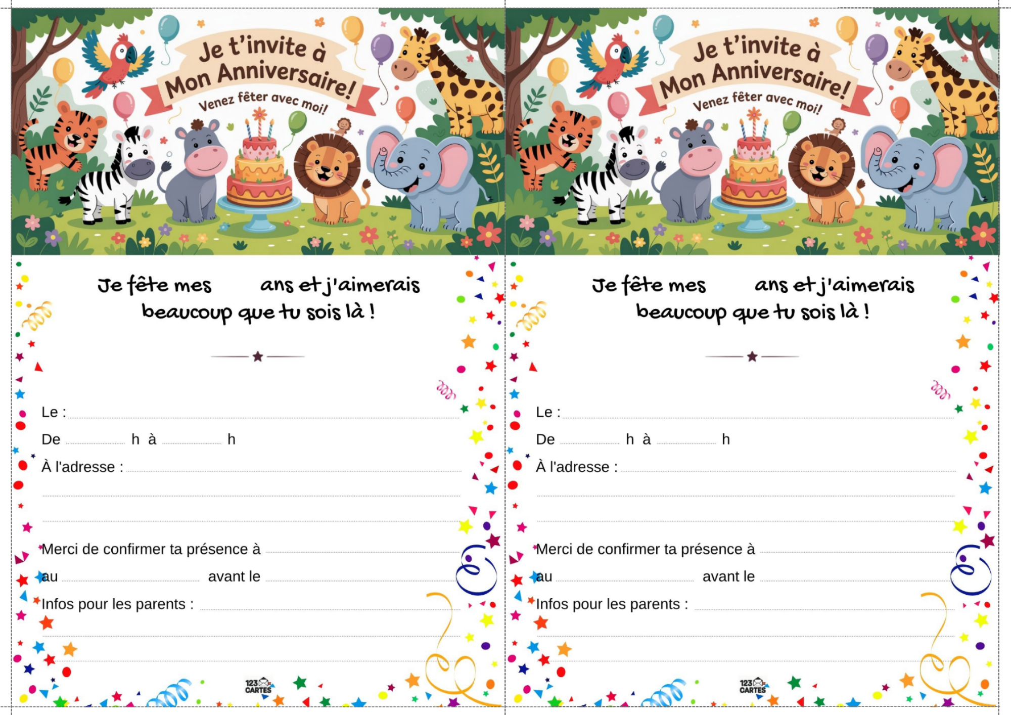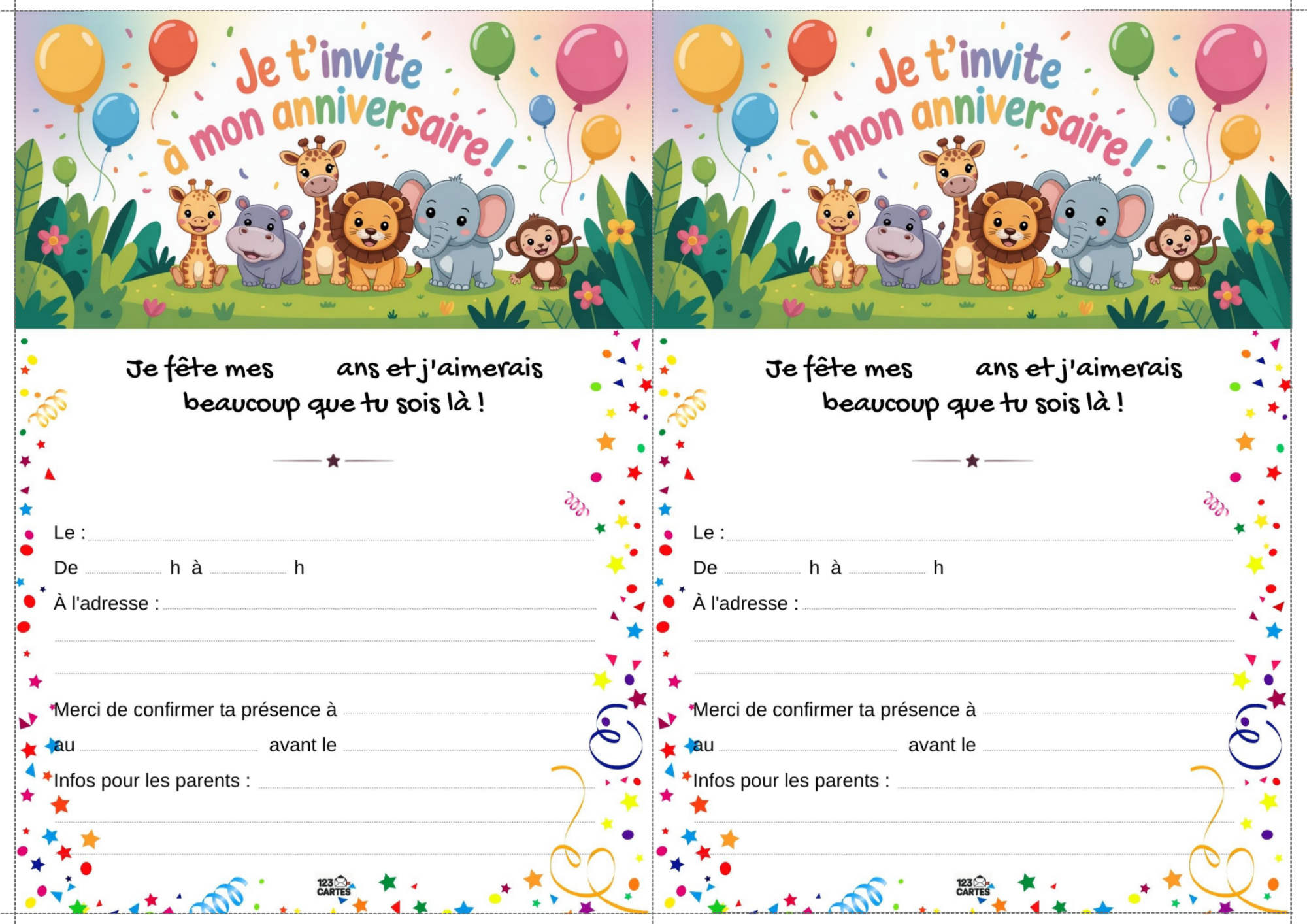 Notre modèle d’invitation sur le thème de la jungle est illustré avec des feuillages, des animaux rigolos et des couleurs vives. Elle est facile à personnaliser avec les informations de la fête : prénom, date, lieu et heure. Vous pouvez l’imprimer à la maison ou l’envoyer par message aux invités. C’est le premier pas vers une aventure inoubliable.