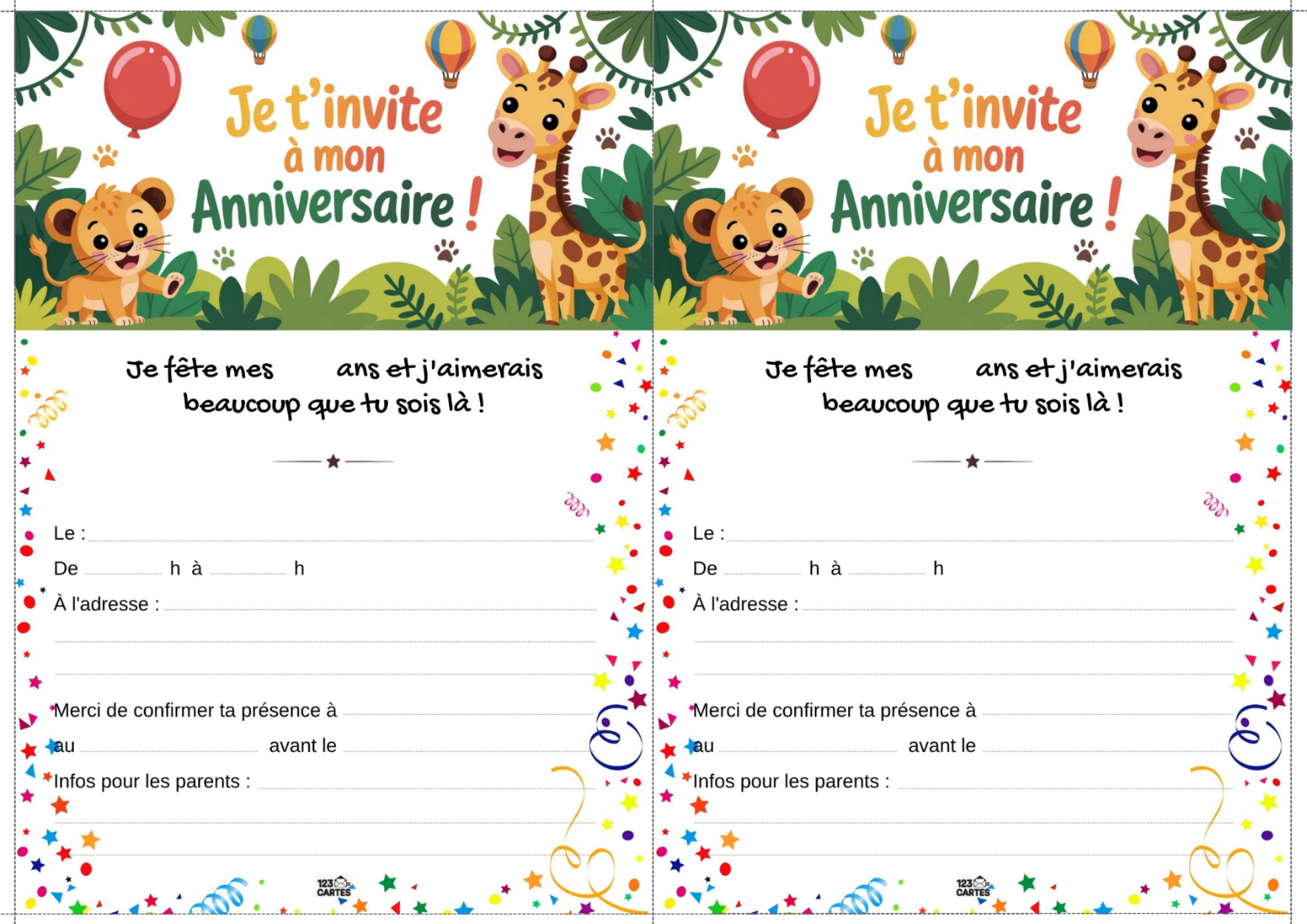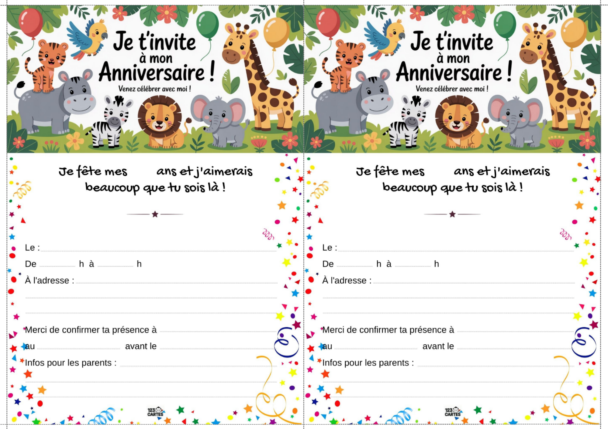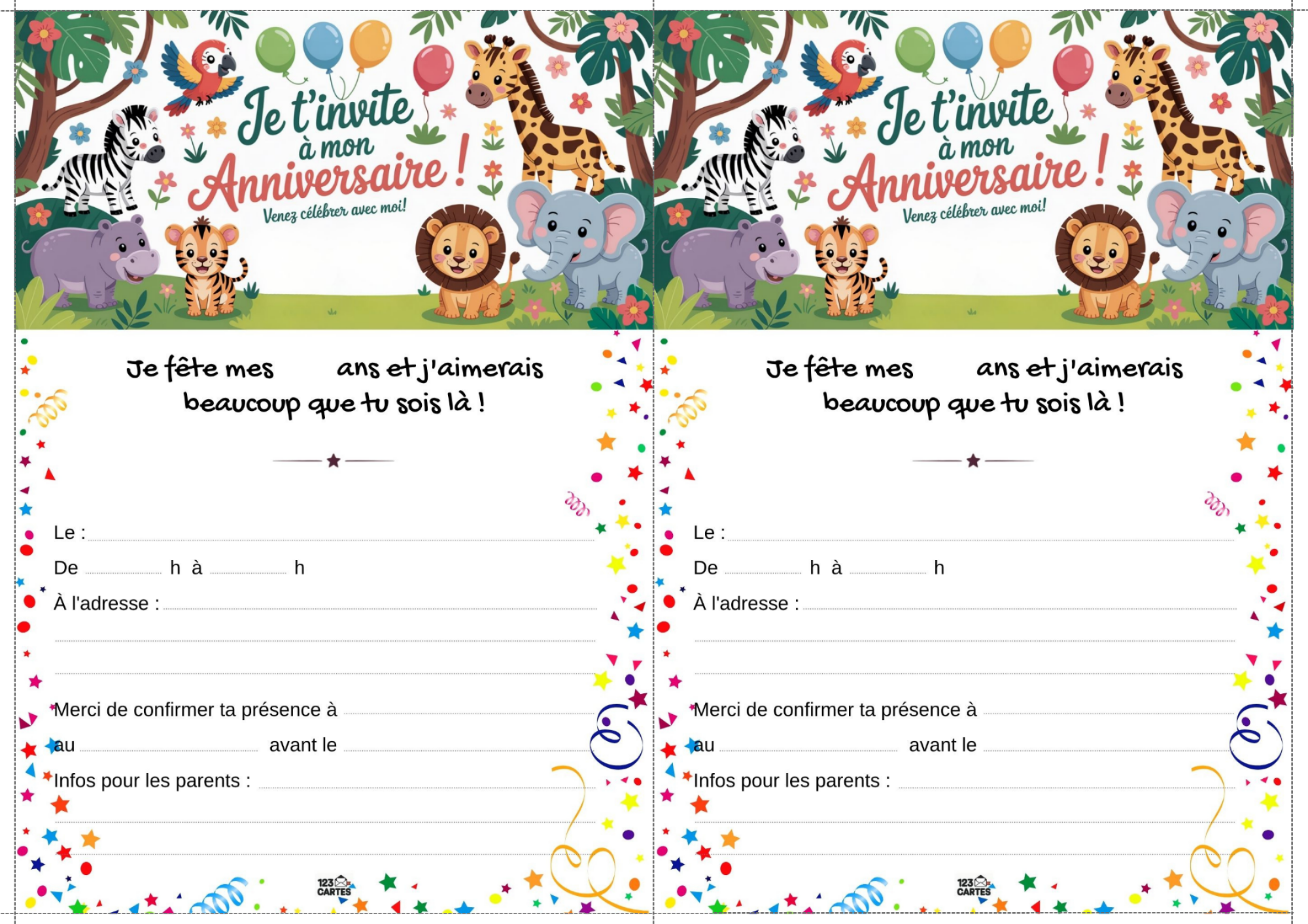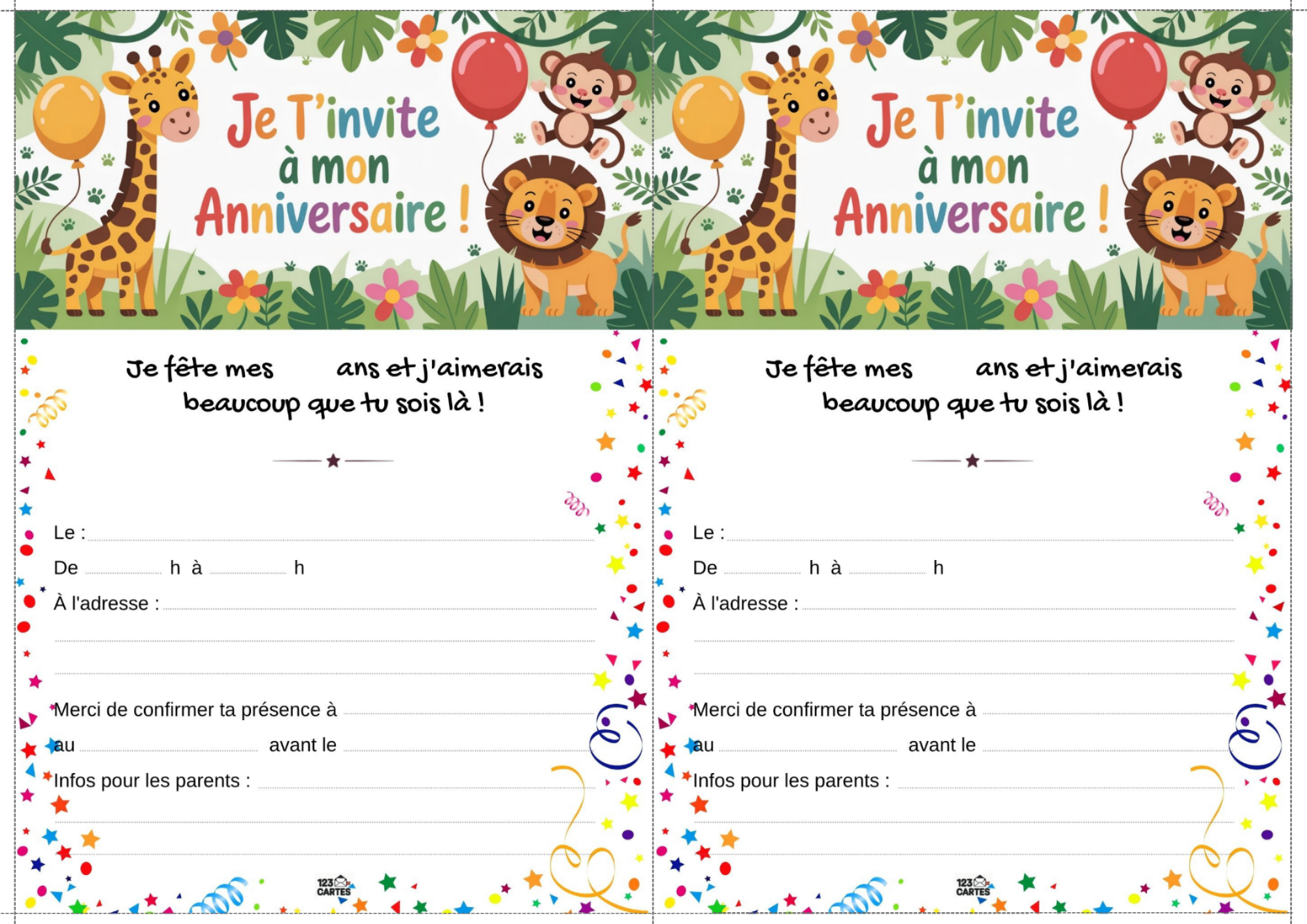 Envie d’une fête pleine d’aventure, de verdure et de rugissements joyeux ? Le thème "Jungle" est idéal pour les enfants curieux, dynamiques et fans d’animaux exotiques. Avec une invitation gratuite à imprimer, vous plantez le décor dès le départ et embarquez les invités dans une expédition festive au cœur de la forêt tropicale.