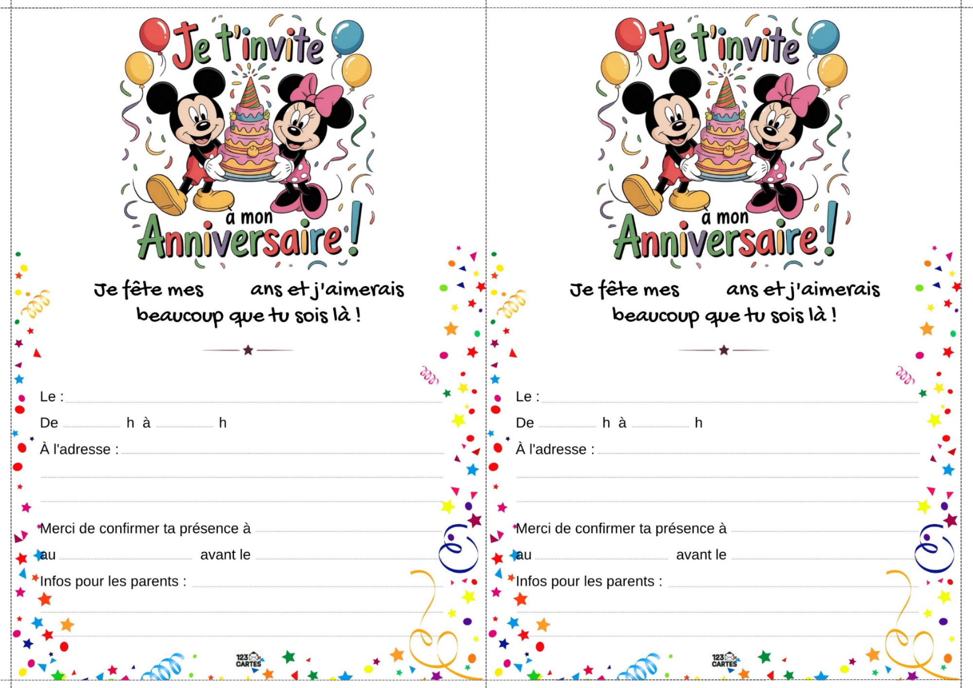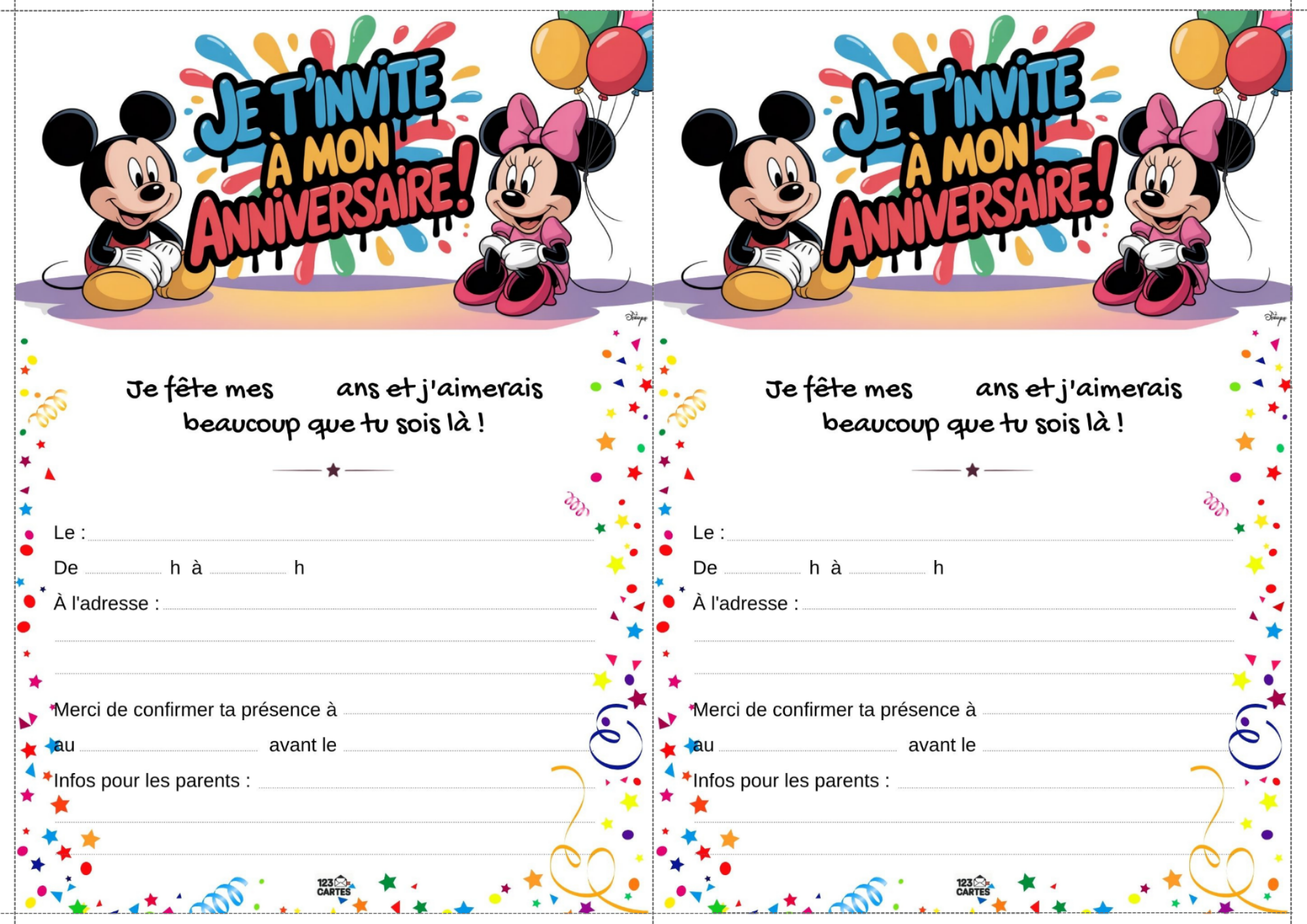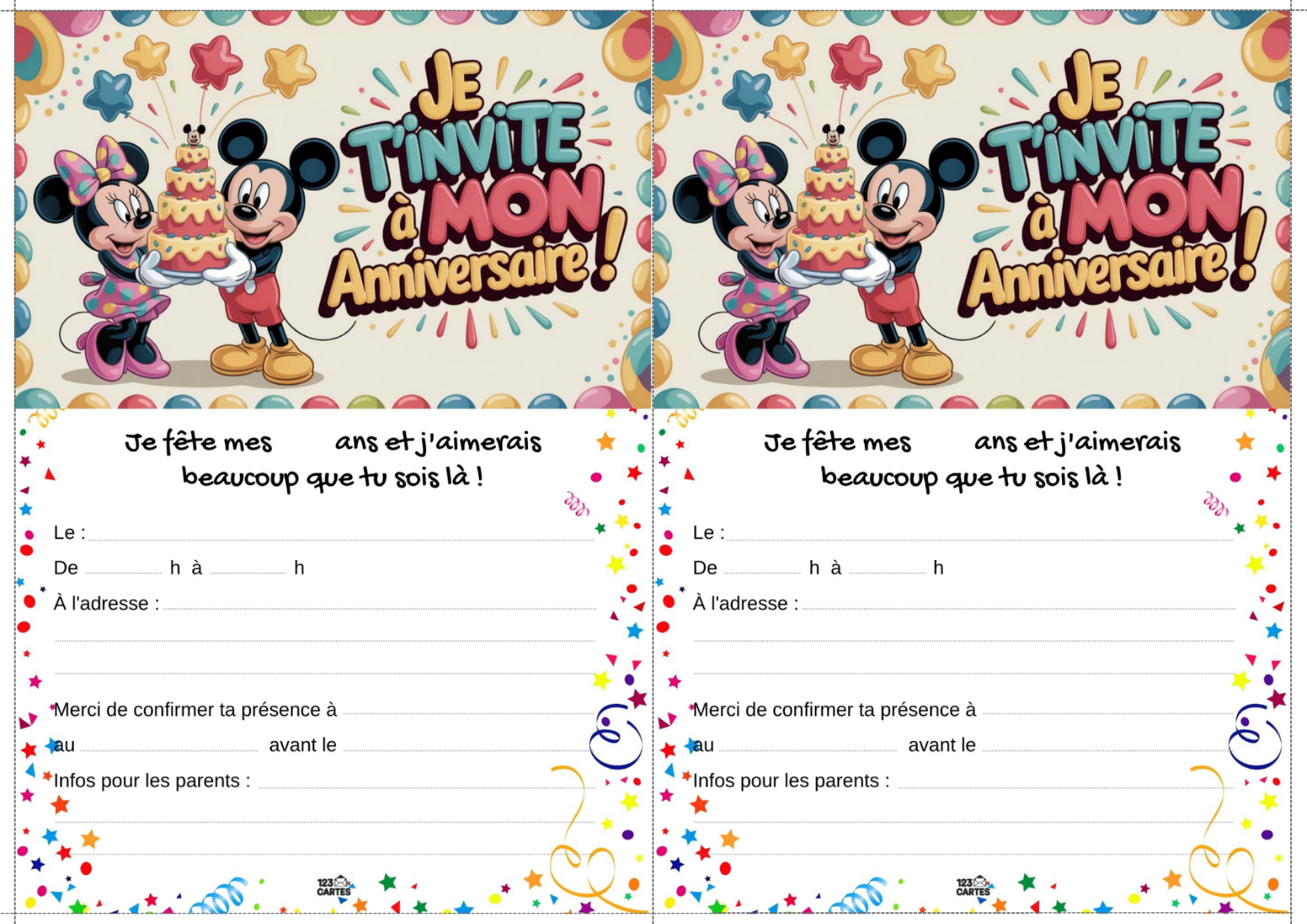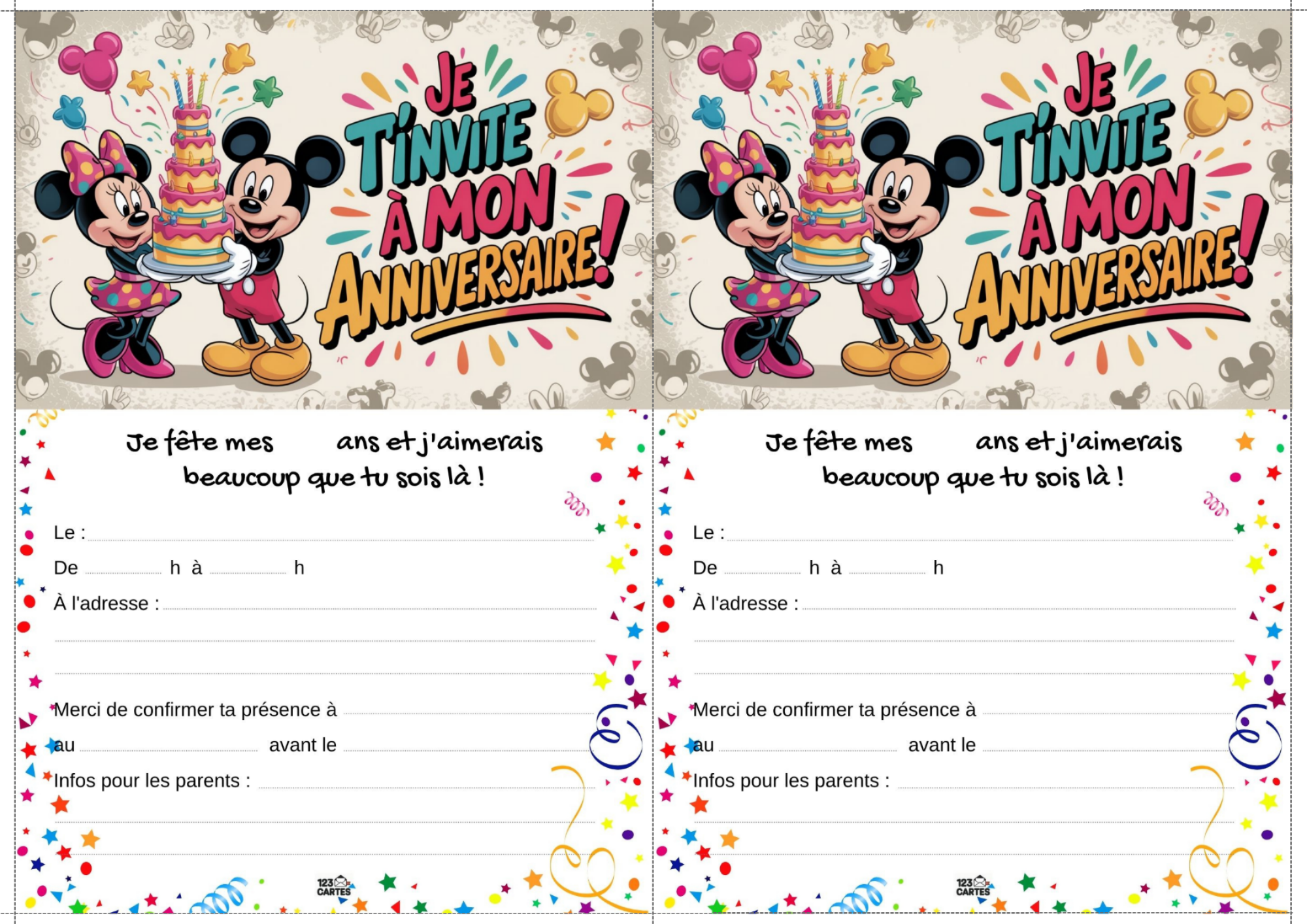 Classiques, adorables et indémodables, Mickey et Minnie sont les compagnons parfaits pour une fête d’anniversaire pleine de bonne humeur. Que votre enfant préfère les oreilles de Mickey ou le nœud de Minnie, ce thème offre une ambiance festive, colorée et facile à personnaliser. Et pour lancer les festivités, notre invitation gratuite à imprimer met tout le monde dans l’ambiance dès le premier coup d’œil.