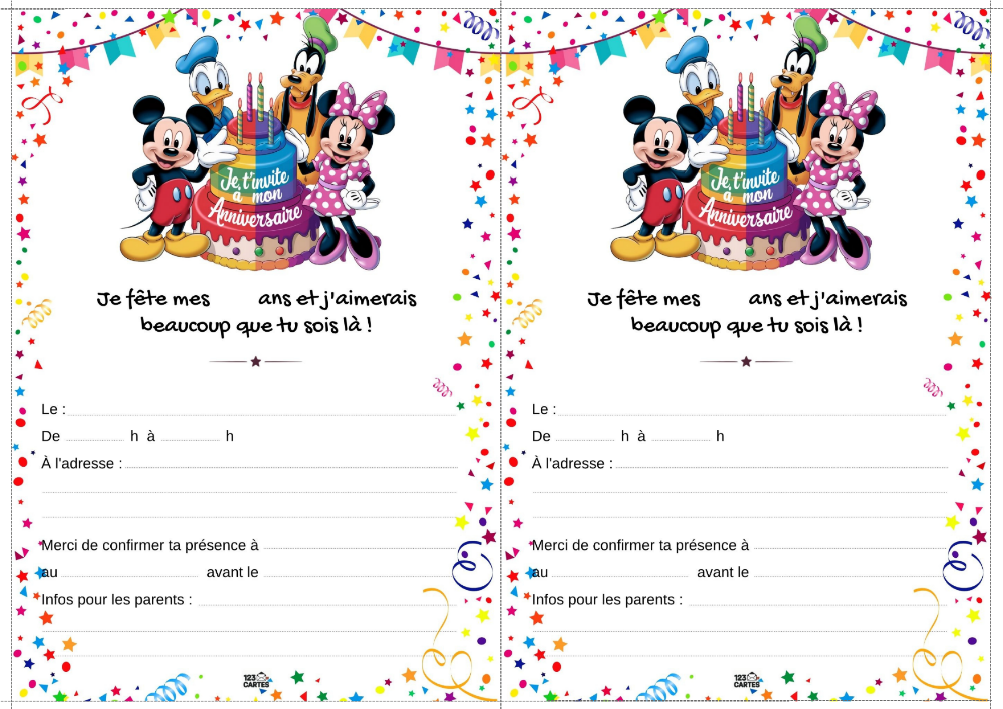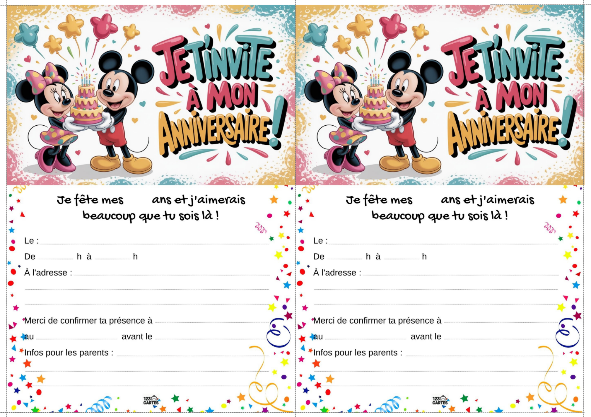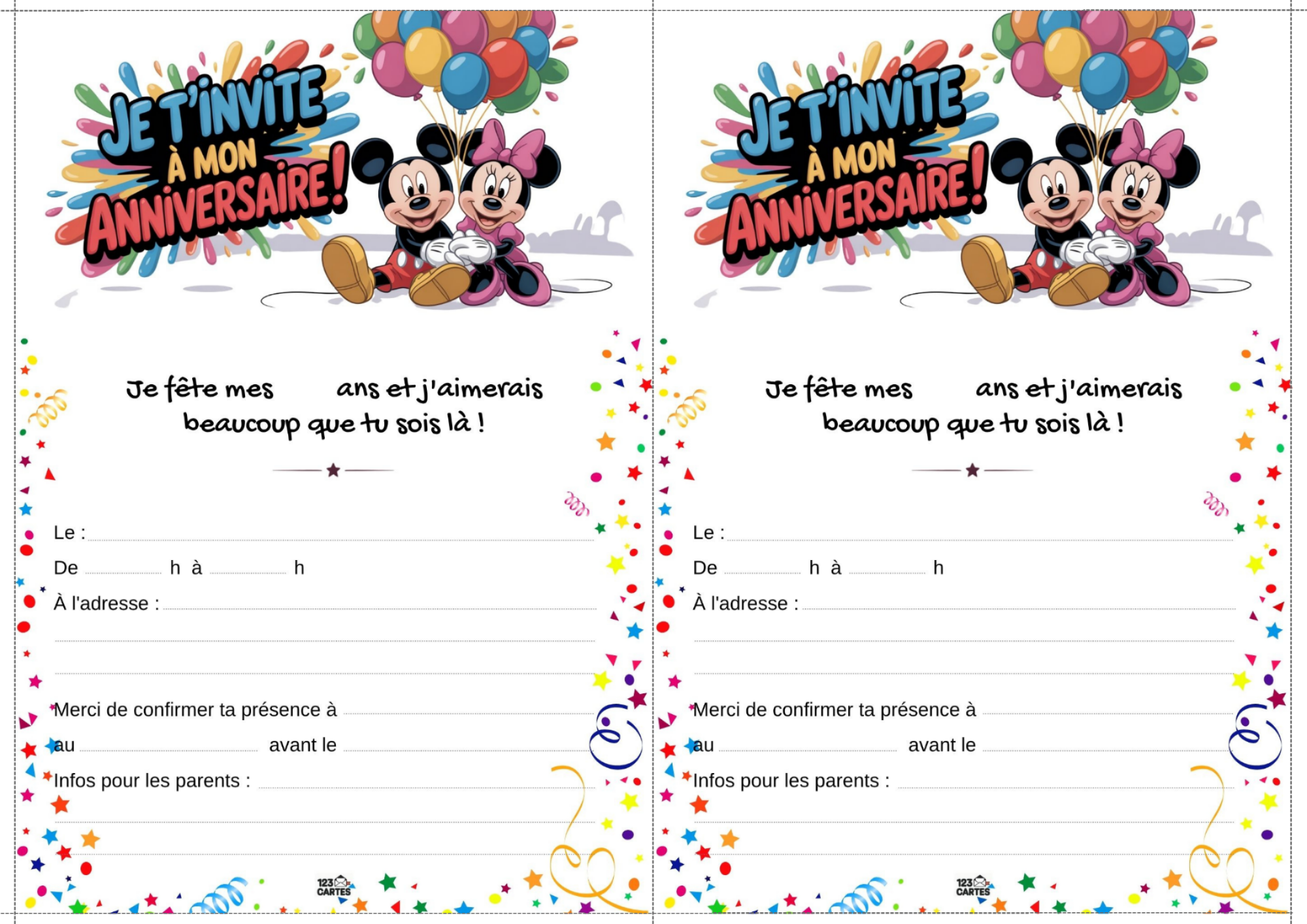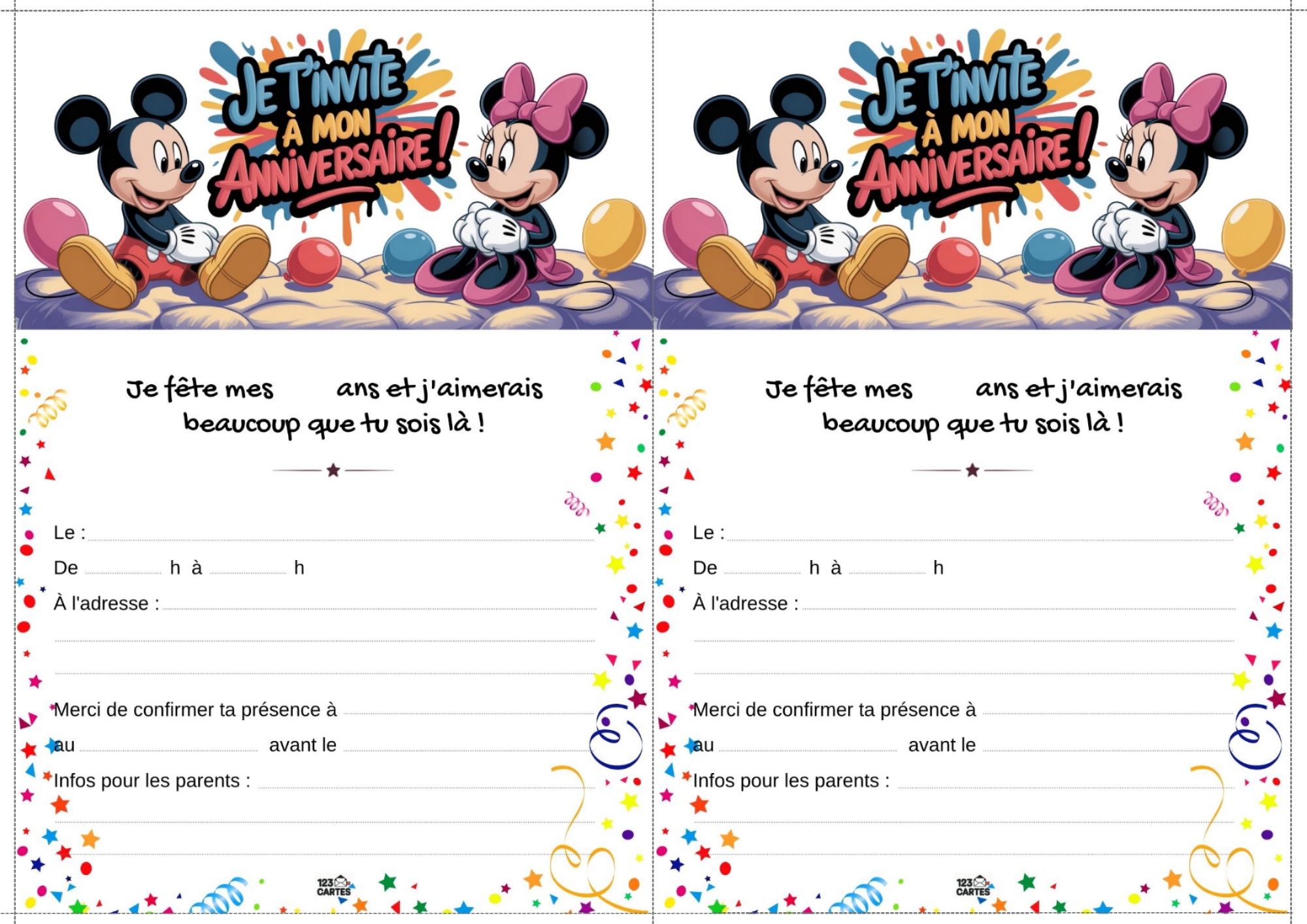 Classiques, adorables et indémodables, Mickey et Minnie sont les compagnons parfaits pour une fête d’anniversaire pleine de bonne humeur. Que votre enfant préfère les oreilles de Mickey ou le nœud de Minnie, ce thème offre une ambiance festive, colorée et facile à personnaliser. Et pour lancer les festivités, notre invitation gratuite à imprimer met tout le monde dans l’ambiance dès le premier coup d’œil.