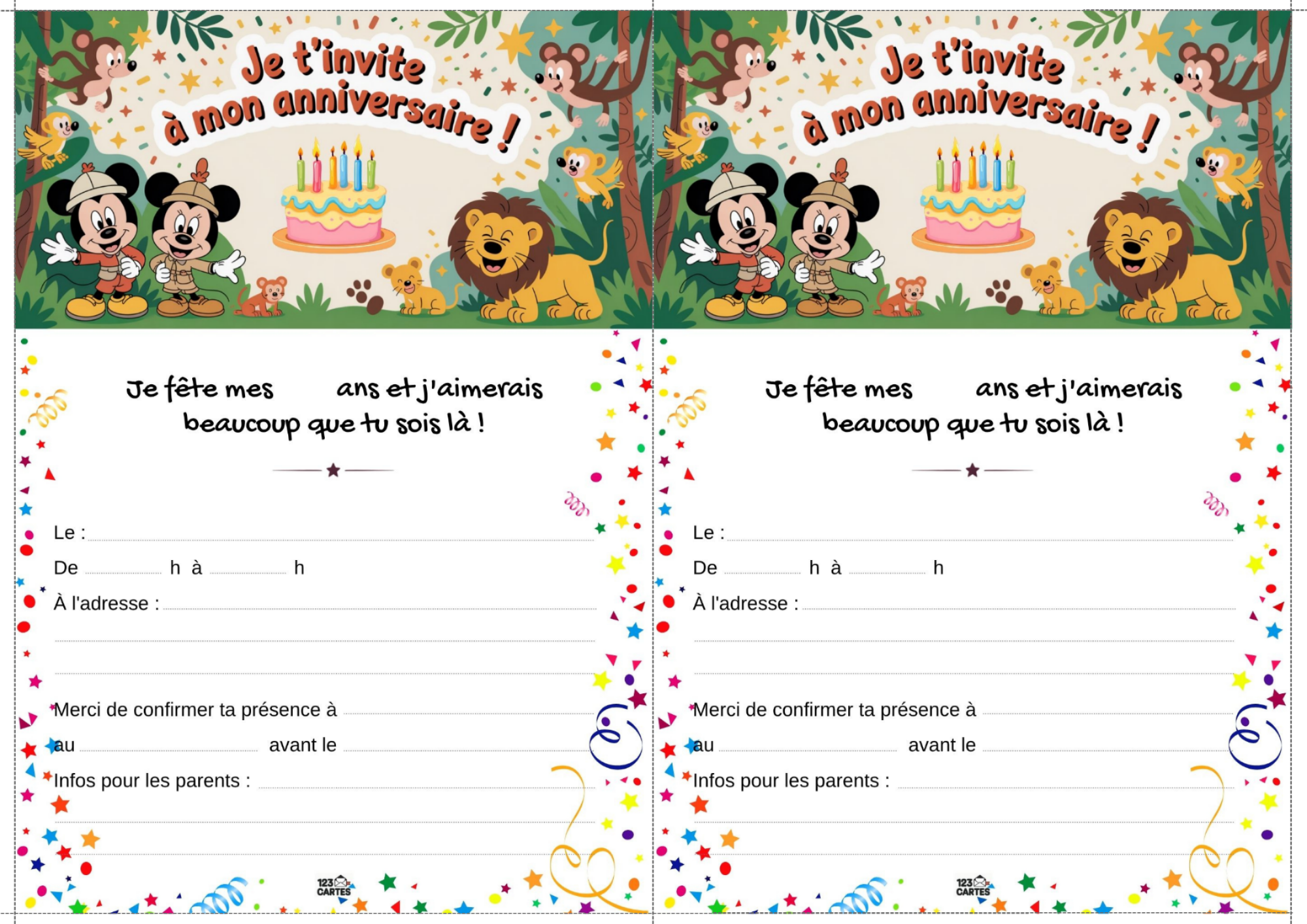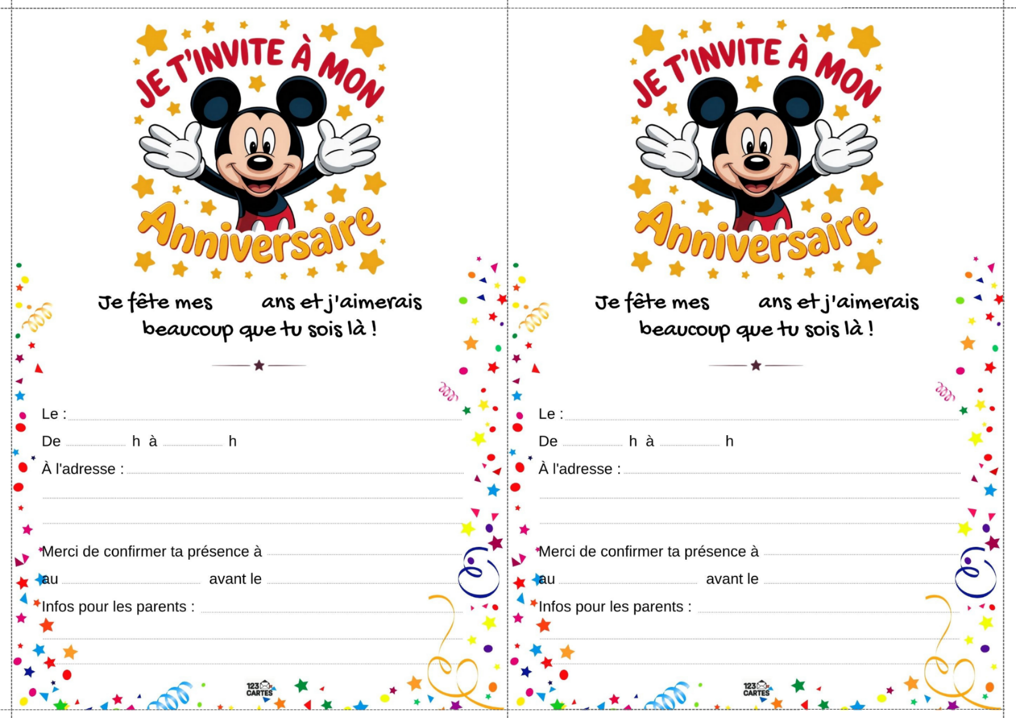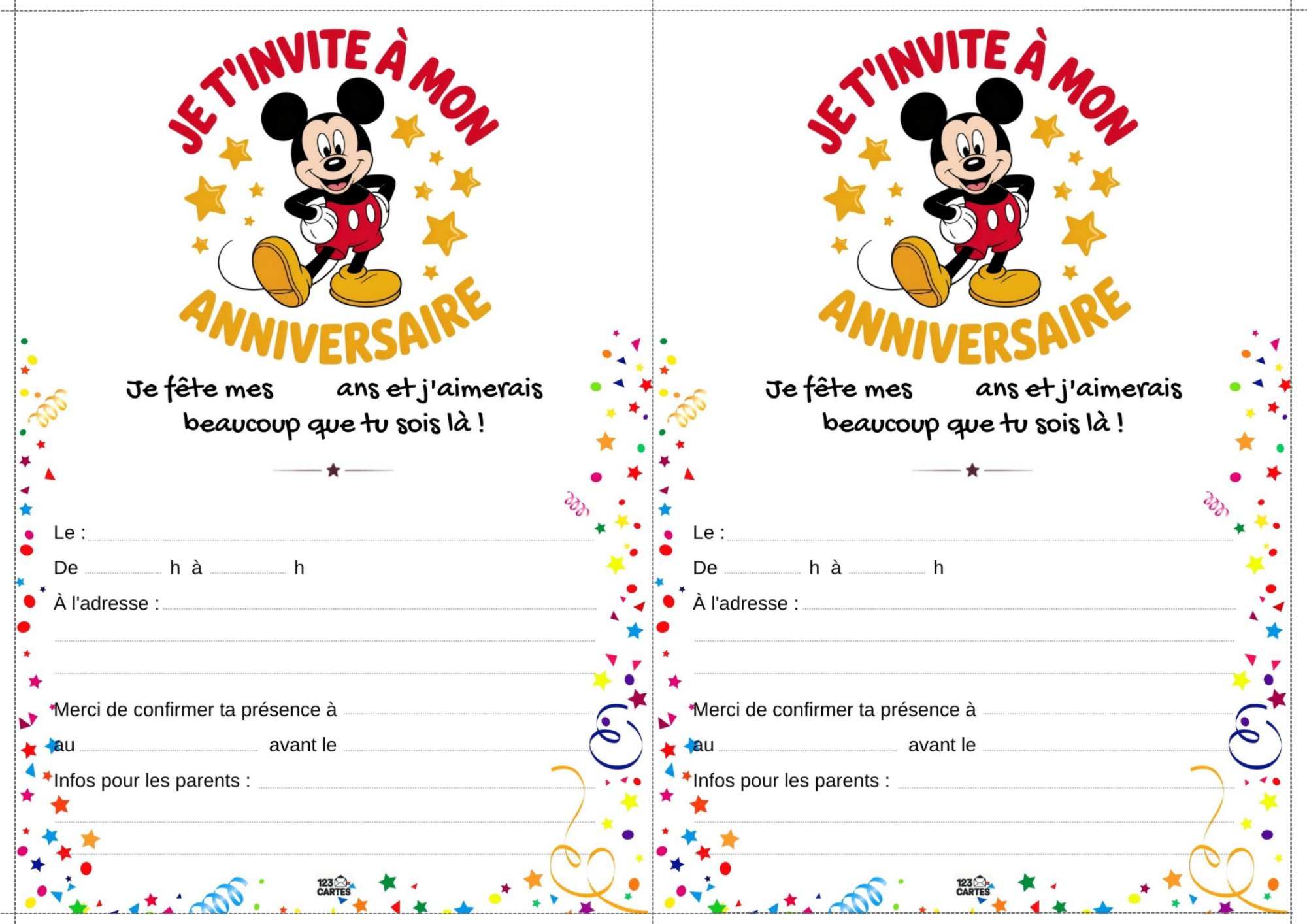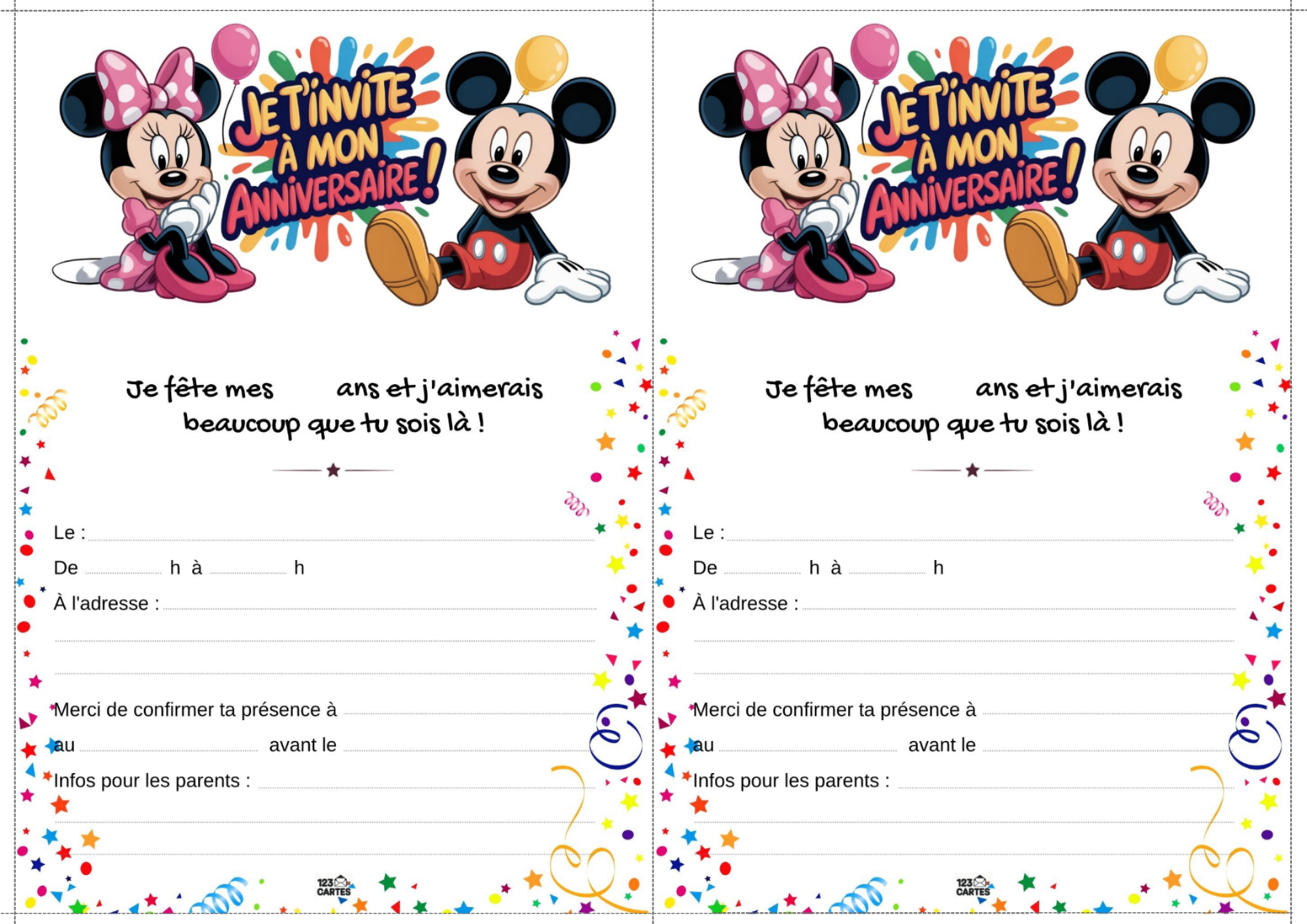 Classiques, adorables et indémodables, Mickey et Minnie sont les compagnons parfaits pour une fête d’anniversaire pleine de bonne humeur. Que votre enfant préfère les oreilles de Mickey ou le nœud de Minnie, ce thème offre une ambiance festive, colorée et facile à personnaliser. Et pour lancer les festivités, notre invitation gratuite à imprimer met tout le monde dans l’ambiance dès le premier coup d’œil.