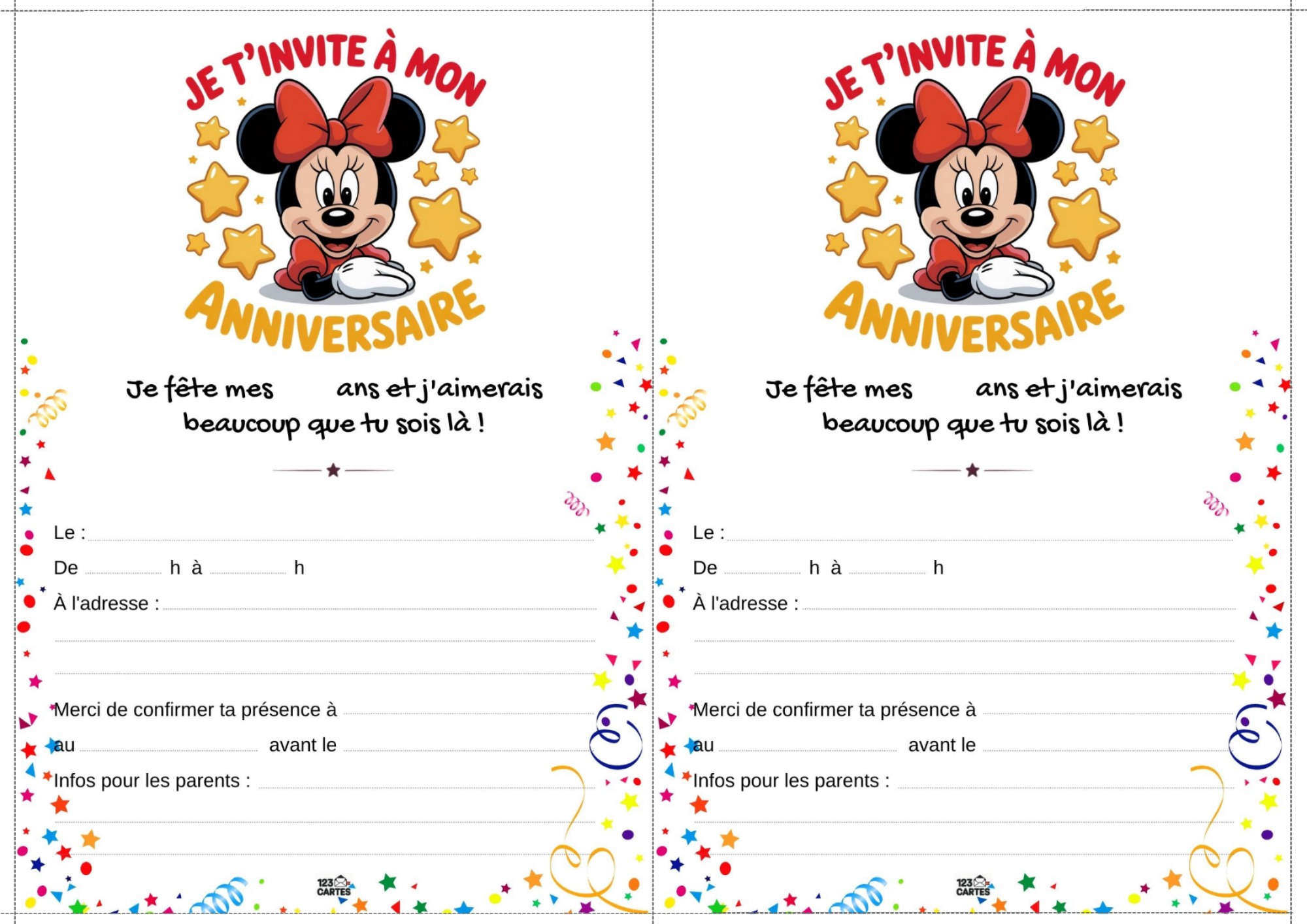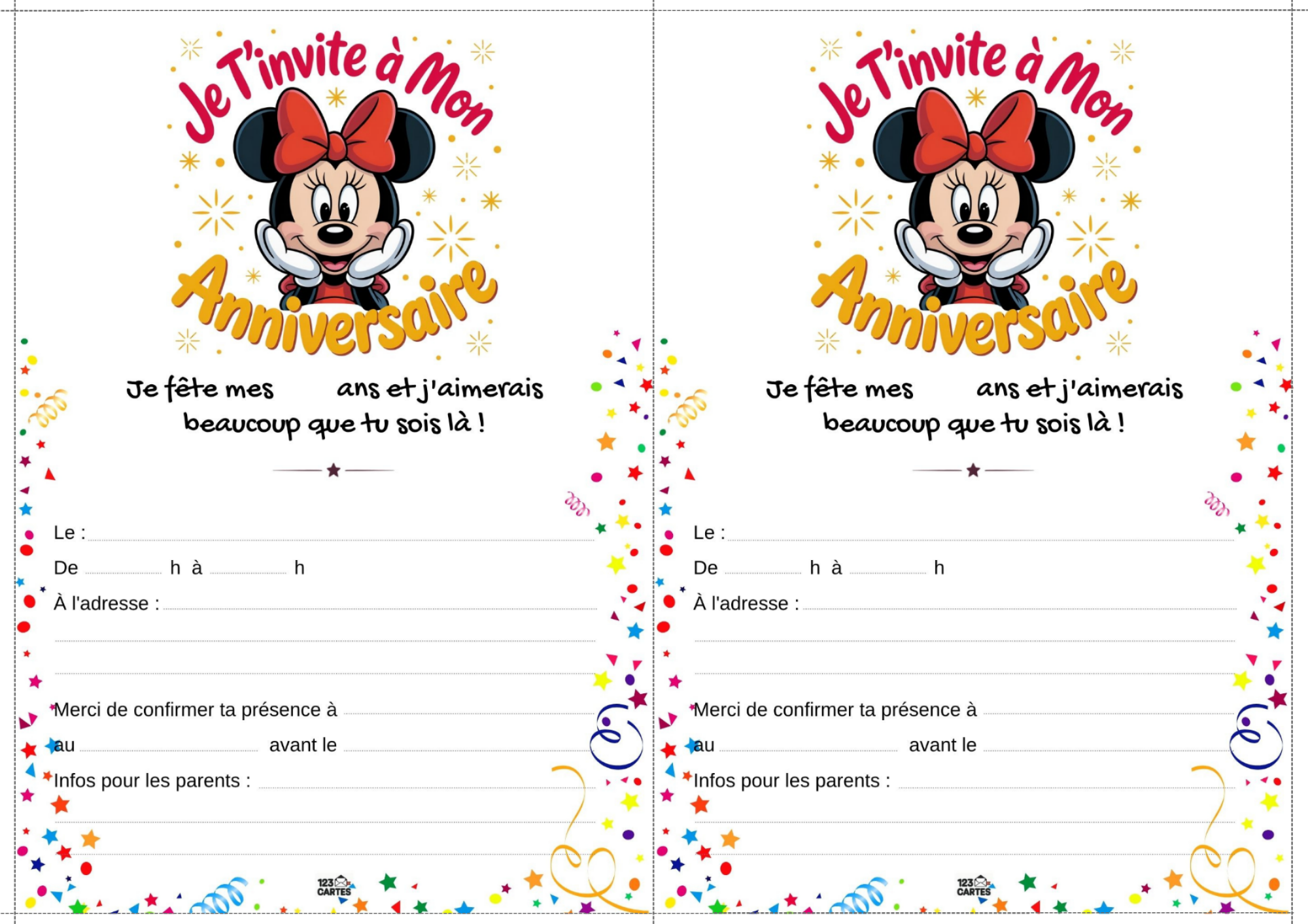 Notre modèle d’invitation Mickey et Minnie est illustré avec des motifs joyeux, des couleurs vives et bien sûr, les célèbres oreilles et nœuds rouges. Elle est facile à personnaliser avec les informations de la fête : prénom, date, lieu et heure. Vous pouvez l’imprimer à la maison ou l’envoyer par message aux invités. C’est le premier sourire de la fête.