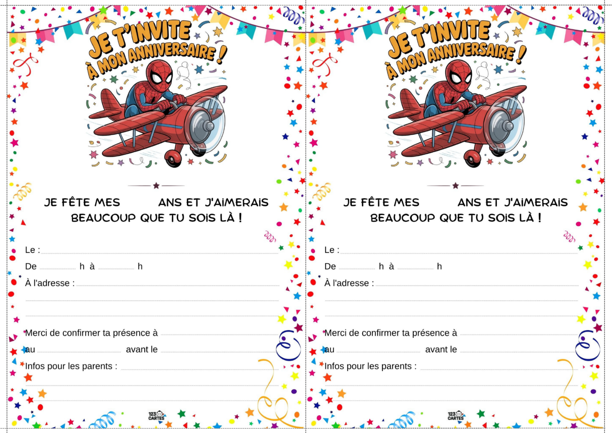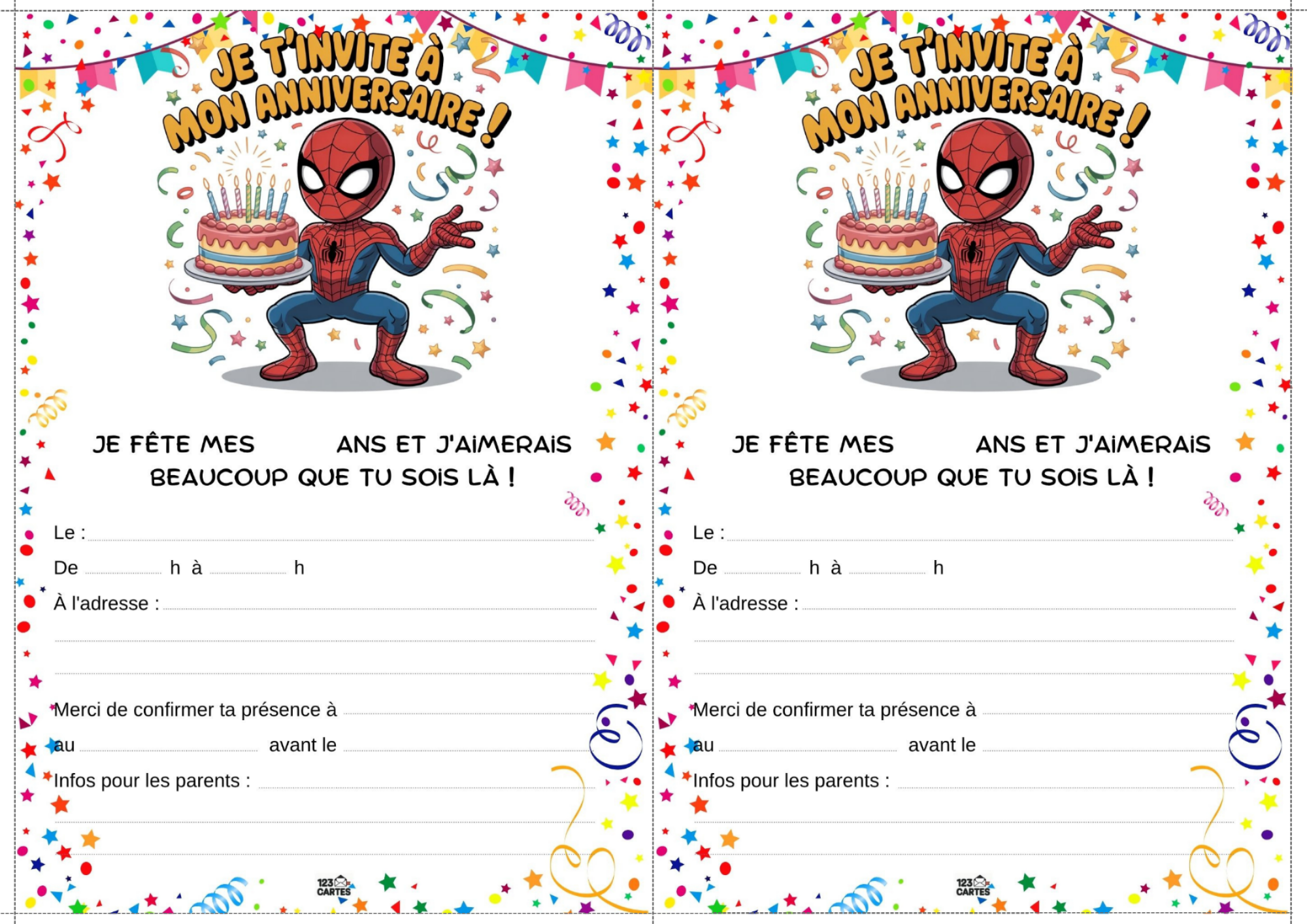 Le modèle d’invitation sur le thème Spider-Man est illustré avec des toiles, des immeubles et le célèbre masque rouge et bleu. Il est conçu pour être imprimé facilement à la maison, avec un espace clair pour noter les informations essentielles : prénom de l’enfant, date, heure et lieu de la fête. Une fois remplie, l’invitation peut être remise en main propre ou glissée dans le cartable des copains.